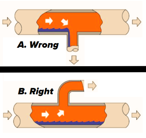 When delivering steam to a process or heat exchanger, it is essential to branch off from the top of the steam main. We see many customers make the mistake of pulling steam from the bottom of the main. They call us out wondering why they are getting water in their application. This occurs because pulling from the bottom essentially creates a dip leg, which traps condensate as it tries to pass by. To ensure the delivery of dry steam and maintain the efficiency of your steam piping, always pull from the top of the steam main.