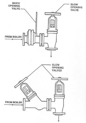 When you are performing a bottom blowdown, it is important to open your values in the correct order. The quick opening valve (if equipped), or inside valve should be opened first, due to its close proximity to the boiler. This will prevent high velocity flow from cutting the seats of this valve, maintaining a tight seal. Next, the slow opening valve is furthest from the boiler and is fully opened second. This valve is designed to take the higher velocity flow and is undamaged. Valves close in reverse order after blowdown occurs. Outside valve closed first, then the inside valve.