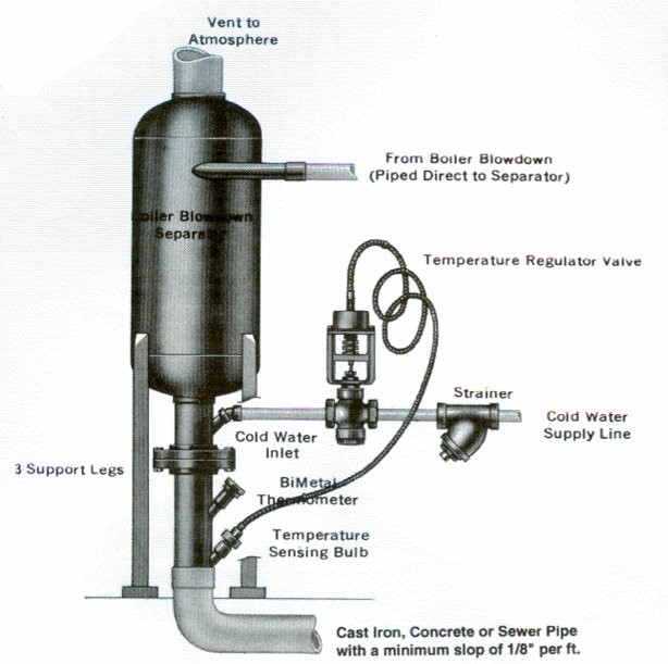 Experts encourage blowdown separator installation for every boiler over 15 psi.. They allow the hot boiler water to drop safely to a lower pressure, then cool the water before it goes down the drain. As the blowdown drains into a blowdown separator, the pressure of the water drops. A vent pipe provides a helping hand to exhaust the product, steam.