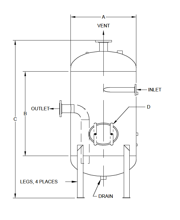Vent Outlet: Located at the top of the tank, the vent releases flash steam to atmosphere. It is usually much larger in diameter than the inlet. For example, a blowdown tank handling a 1” or 1½” blowdown line might have a 4”–6” vent pipe. This large vent area ensures the flashed steam can escape quickly without over-pressurizing the vessel. The vent is routed to a safe discharge point outdoors – typically above the roof. It must be installed as straight and short as possible to minimize back-pressure, and often includes a visible outlet (e.g. vent stack).
