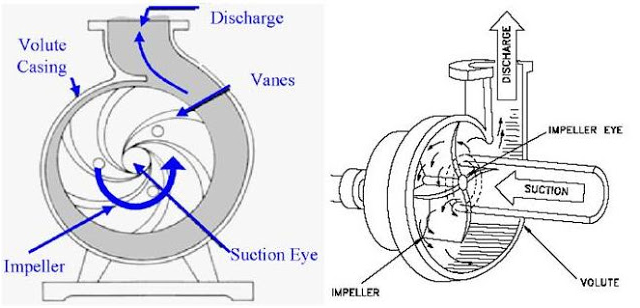● On the other side, the volute causes the fluid to slow down and the pressure inside the pump’s housing begins to increase. This increase in pressure forces the liquid out the discharge (outlet) of the pump and then on to the piping systems of the process.