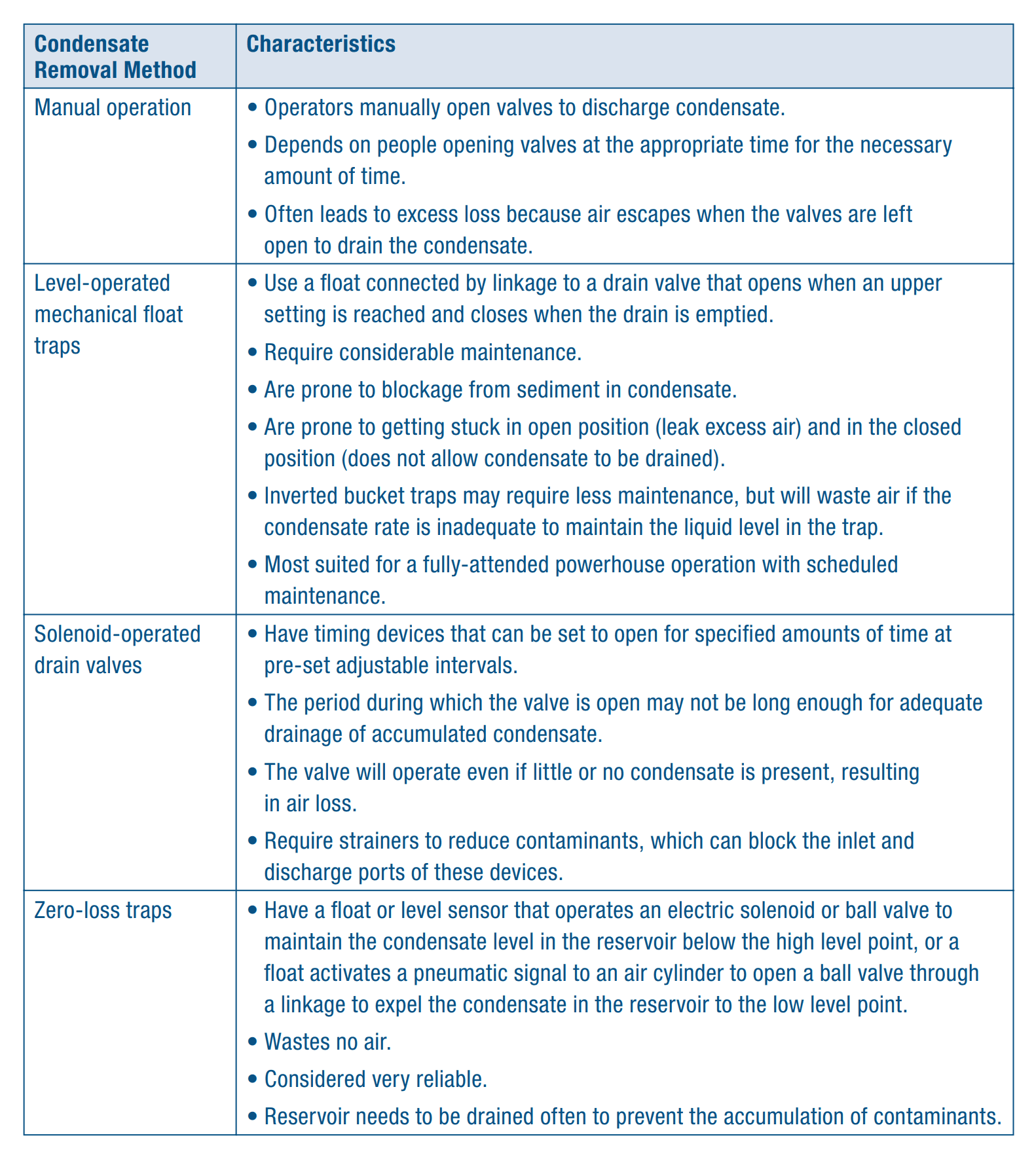 To increase efficiency and maintain air quality for end-use equipment, condensate must be removed from the compressed air. There are many effective ways to do this. It is important to be cognizant of the removal method because each has its own levels of potential compressed air loss. The U.S. Department of Energy Efficiency and Renewable Energy created a simple chart to help you determine the appropriate means of draining condensate: