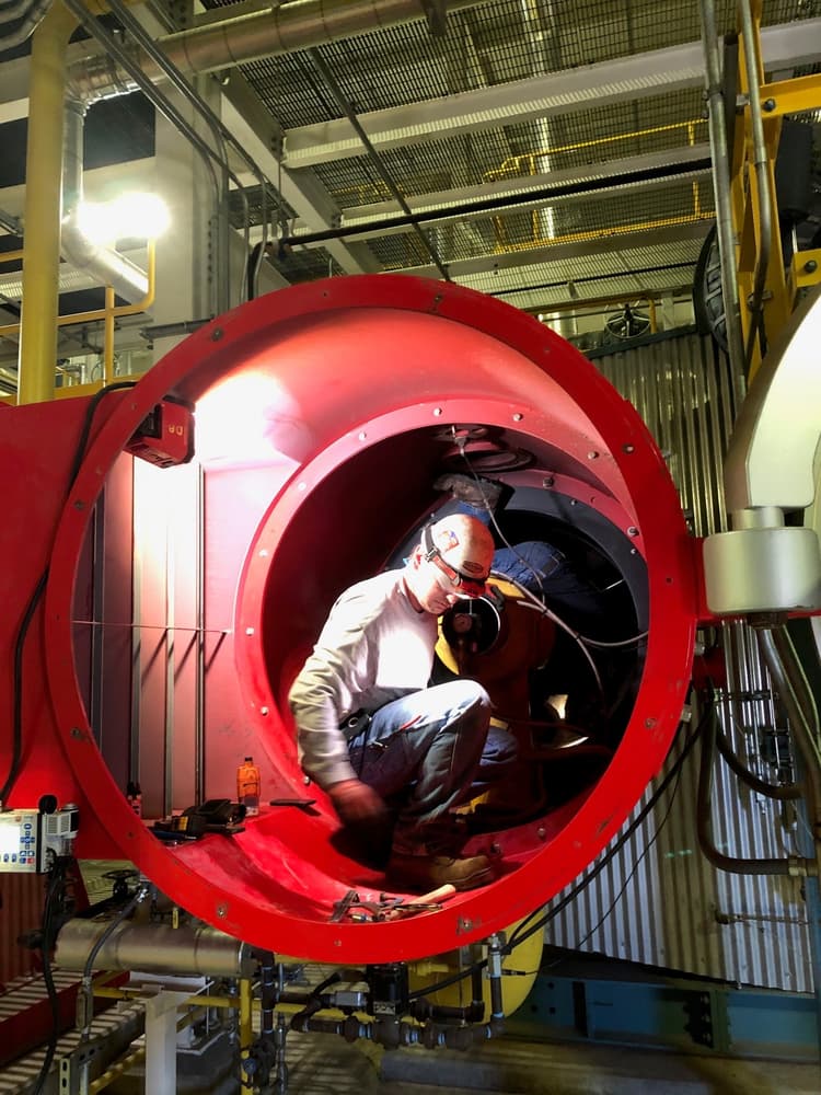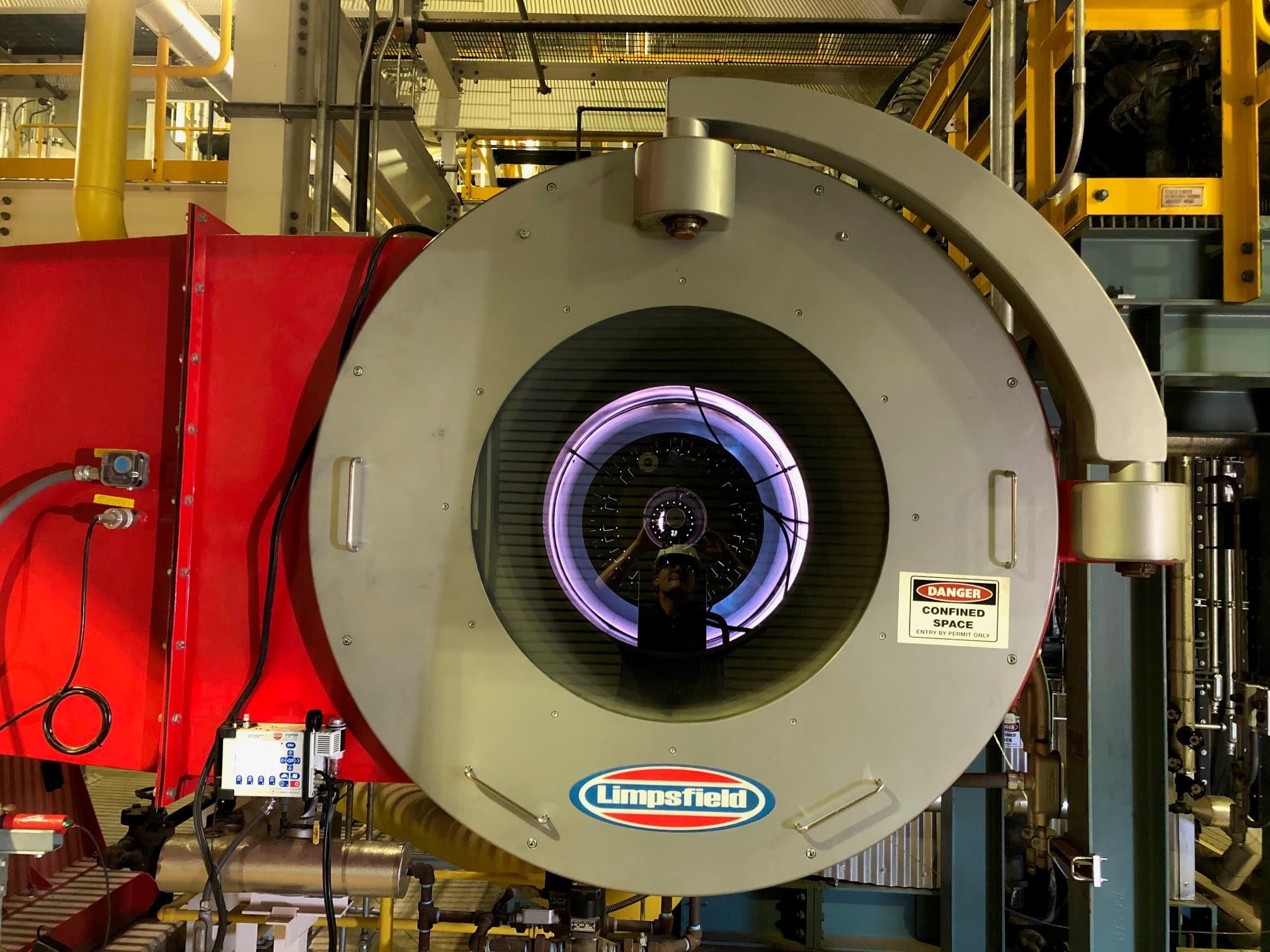 Rasmussen Mechanical's burner technicians tuning a massive duel fuel Limpsfield burner.(Natural Gas and Fuel Oil as back-up) This burner is attached to a 3,600 BHP Cleaver Brooks boiler with Autoflame controls that we installed three years prior as part of a plant expansion.