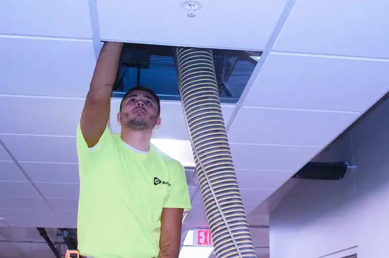 Rasmussen Mechanical Services technician performing HVAC airflow balancing and performance testing inside a commercial facility to ensure efficiency and compliance.